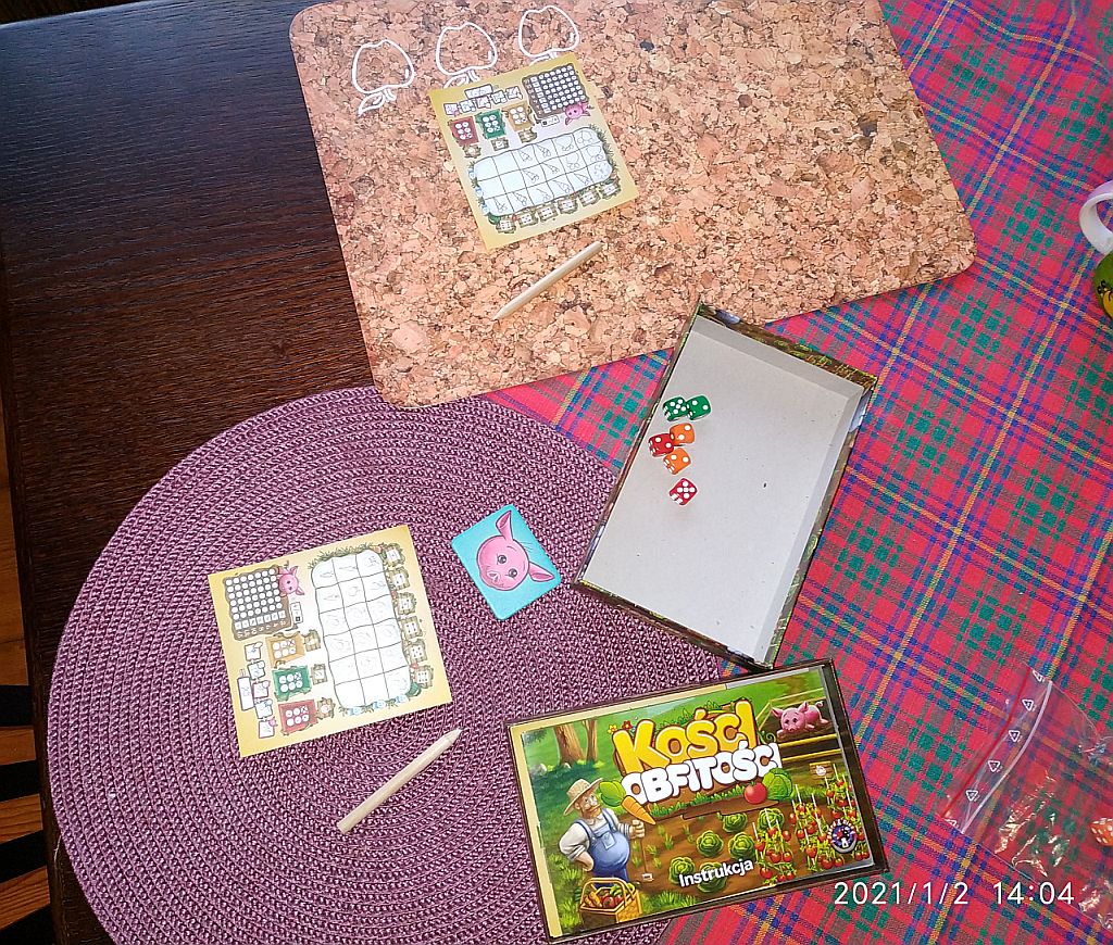 Kości Obfitości trafiły na Regał w ramach prezentu świątecznego dla moich synów. Przeznaczona jest przede wszystkim dla dzieci. Dobieranie kości o odpowiednich wartościach i kolorach połączone z kreatywnym rysowaniem warzyw w ogródkach bardzo przypadło do gustu najmłodszym. Przeznaczony dla starszych wariant zaawansowany również daje radę.